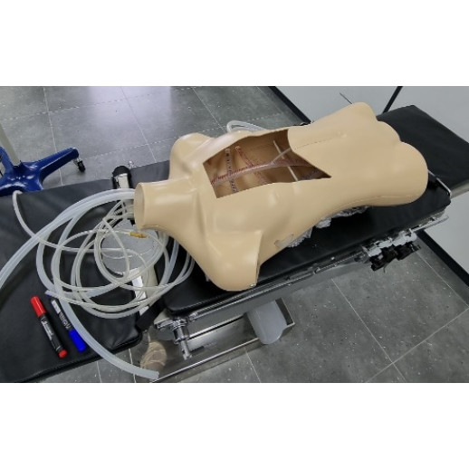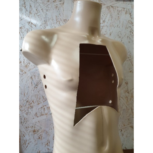 Муляж грудной клетки с имитацией срединной стернотомии с двумя силиконовыми трубками внутри, имитирующие аорту и полые вены с отверстиями для канюляции.